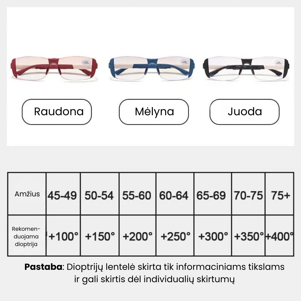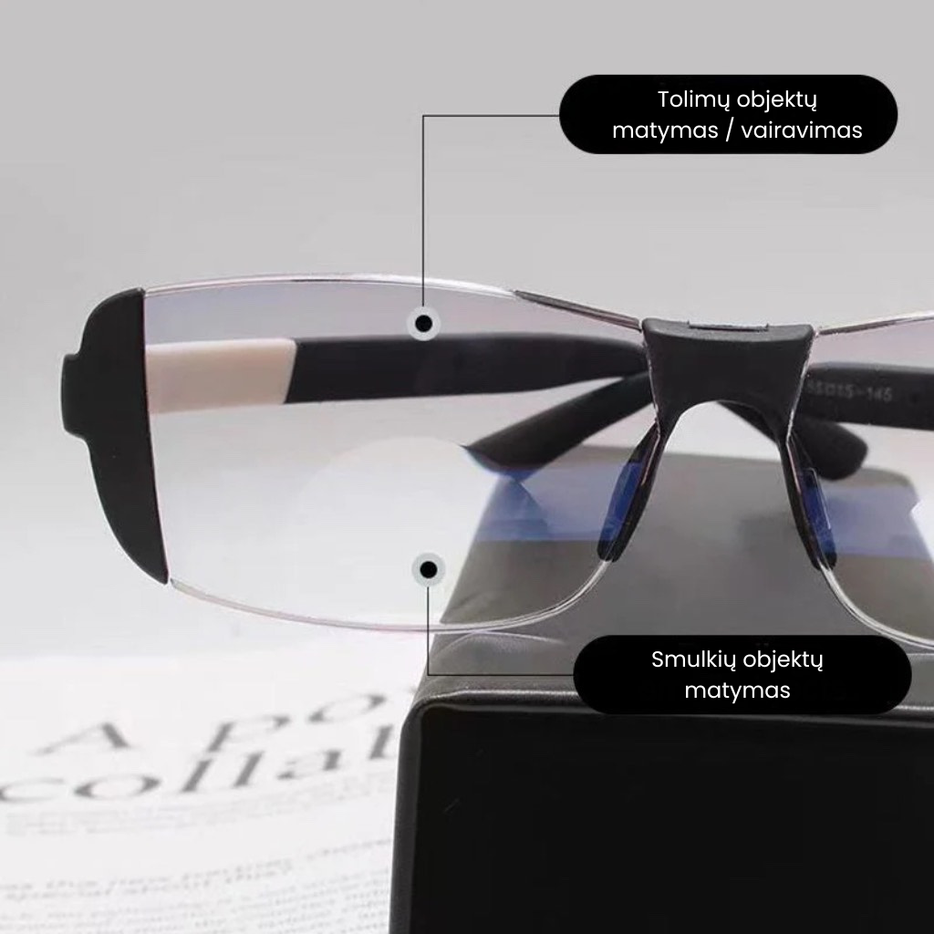 - Komplektą sudaro: 1 × akių nuovargį mažinantys, dviejų židinių (arti ir toli) skaitymo akiniai