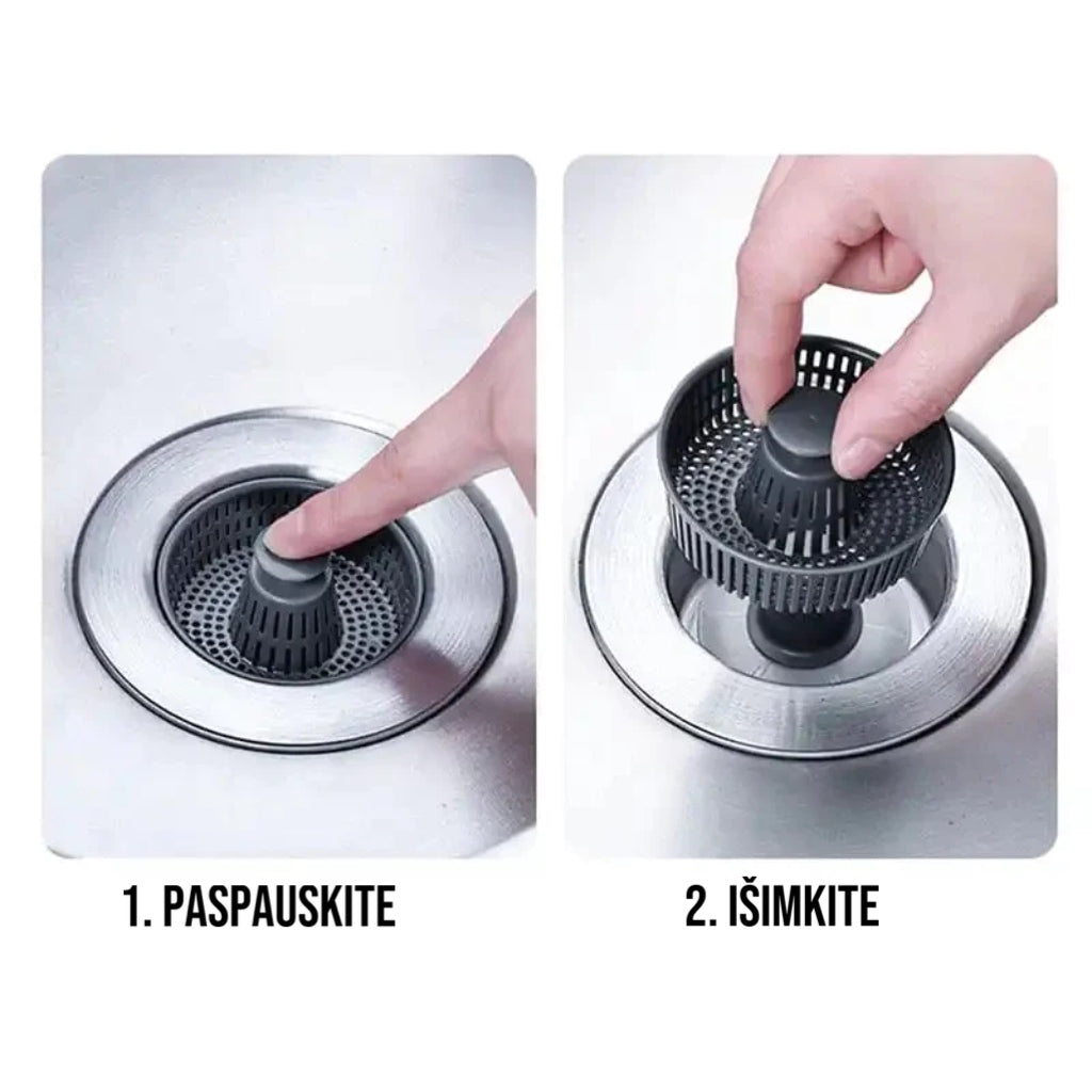 Jį lengva naudoti, tiesiog lengvai paspauskite atšokusią šerdį, kad ji virstų kriauklės kamščiu vandeniui laikyti. Paspauskite dar kartą, kad vanduo pratekėtų, o virtuvės atliekos liktų filtre.