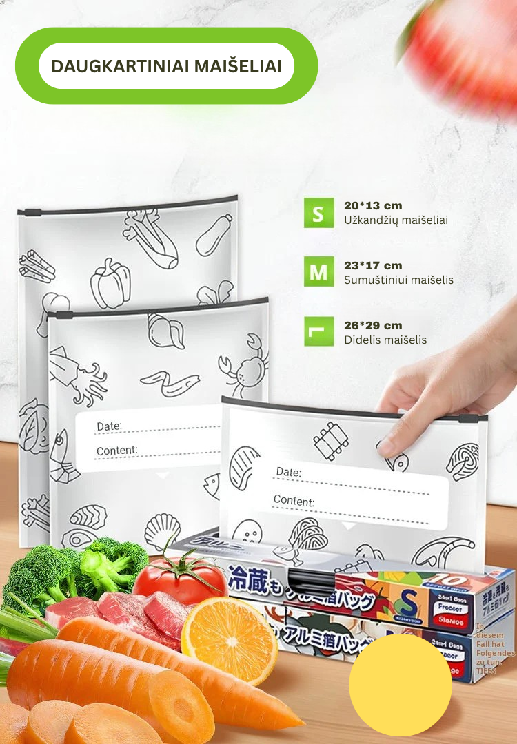 Mūsų daugkartiniai sandarinimo maišeliai yra puikus sprendimas, kuris padės išlaikyti maisto produktus šviežius ilgą laiką ir sumažins atliekų kiekį!