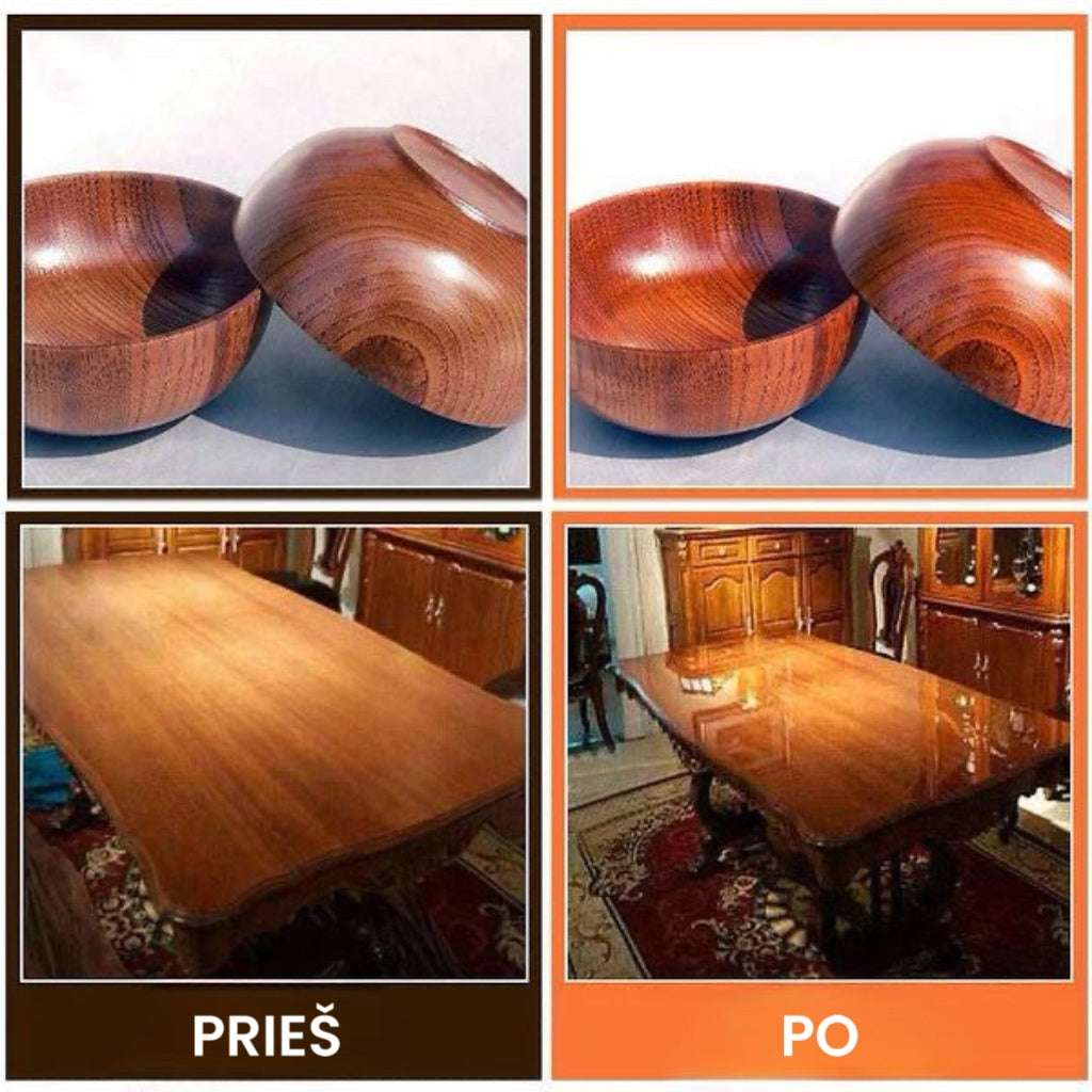 SENŲ MEDINIŲ BALDŲ ATNAUJINIMAS: šis produktas pašalina riebalus, purvą ir nusidėvėjimą nuo dažų paviršiaus. Jį galima saugiai naudoti baldams, pagamintiems iš bičių vaško ir apdorotos medienos. Jis taip pat valo ir poliruoja medines grindis! Išlyginkite, užtepkite ir nuvalykite medienos kondicionierių, per daugelį metų susikaupę nešvarumai išnyks jūsų akyse, suteikdami baldams naują išvaizdą.