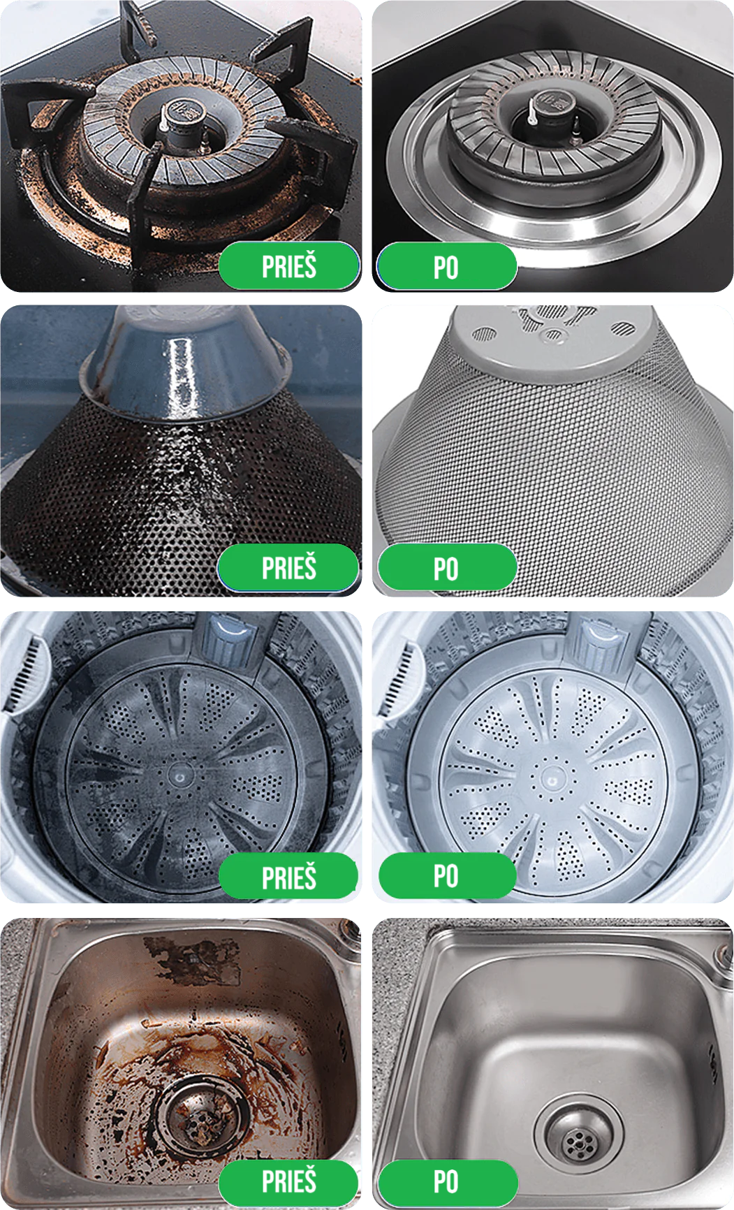 Pašalina rūdžius, riebalus, rūdžius ir senas dėmes.