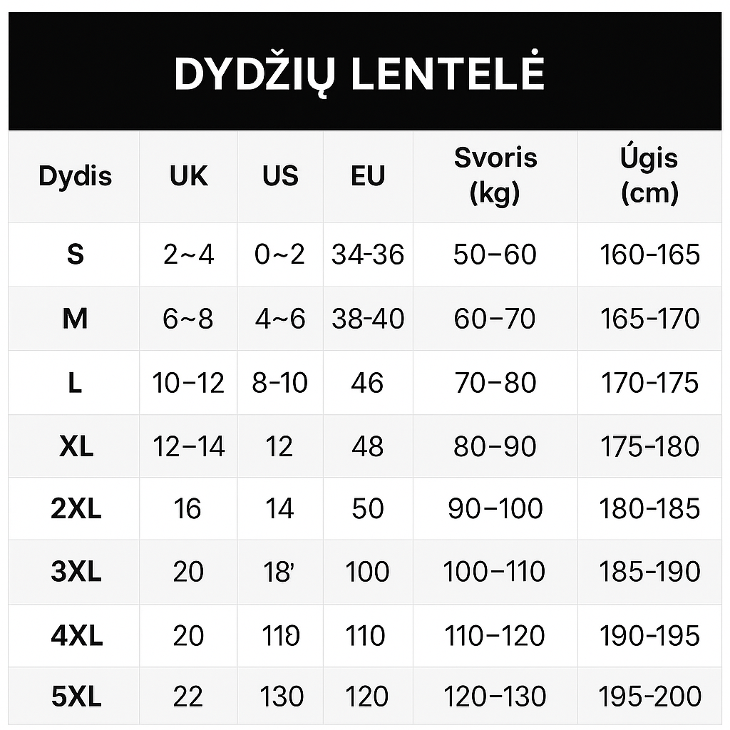 - Dydžiai: XS/S, M/L, L/XL, 2XL/3XL